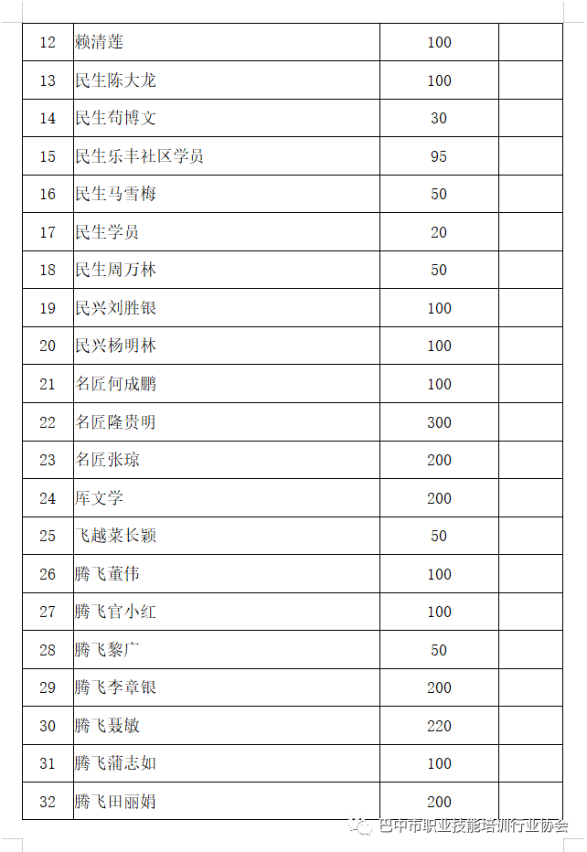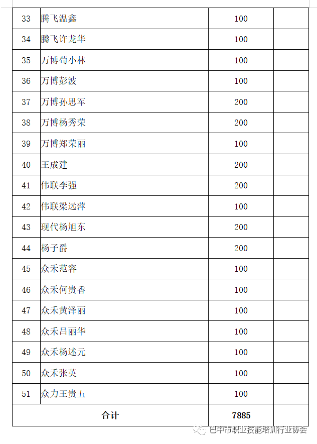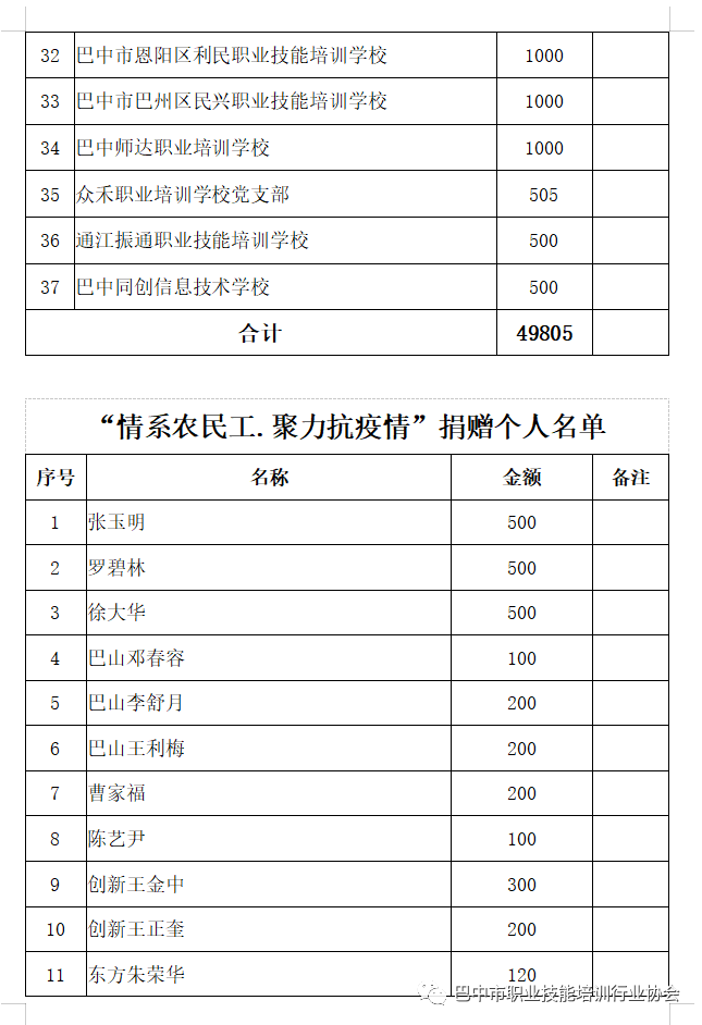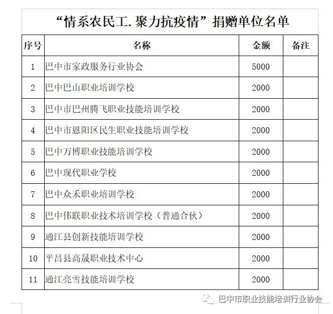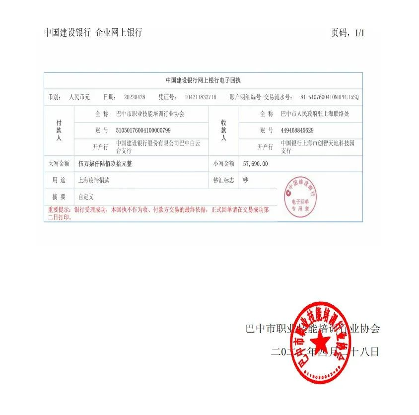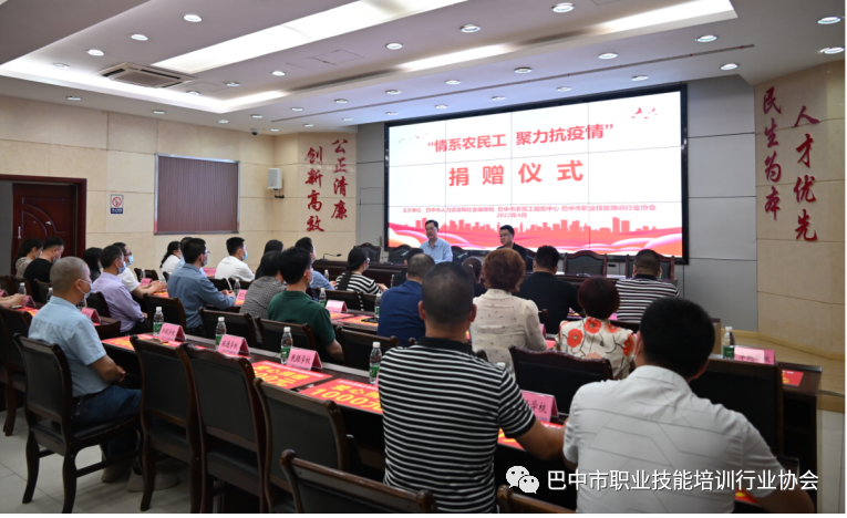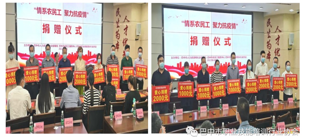 2022年4月27日14时,巴中市人力资源和社会保障局、巴中市农民工服务中心、巴中市职业培训行业协会联合举办了“情系农民工 聚力抗疫情”捐赠活动。 捐赠仪式由巴中市农民工服务中心徐大华主任主持。徐主任代表巴中市人力资源和社会保障局、巴中市农民工服务中心,对巴中市职业技能培训行业协会为做好在沪巴中籍农民工服务保障工作,助力上海抗疫而发起的爱心活动,给予了充分地肯定和高度赞扬。 来自市内各县区的37个职业培训机构和51位教职员工、社会人士为支援上海抗疫,援助在沪巴中籍生活困难农民工慷慨解囊,筹集善款57690.00元,于2022年4月28日转账至巴中市人民政府驻上海联络处专账。 |
